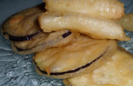 Cuando el aceite esta bastante caliente vamos bañando la berenjena y la cebolleta en la gacheta que hemos preparado y se pone a freír hasta que coja el color dorado que es cuando se debe de sacar, así sucesivamente hasta que lo tengamos todo.