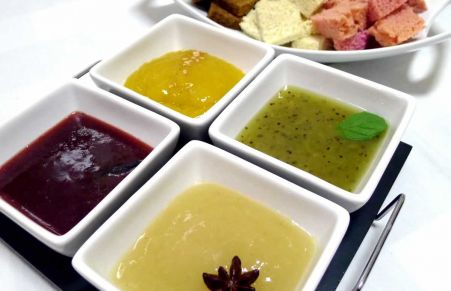 Surtido de mermeladas (fresa/vainilla, pera/anís, kiwi/hierbabuena y mango/jengibre) y panes (remolacha, maíz y jengibre)
