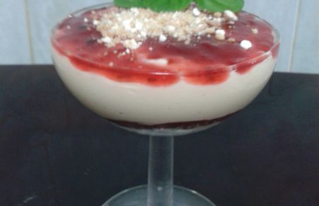 Crema mousse de limón con crujientes y mermelada de frutos rojos