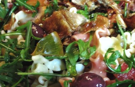 Ensalada de pasta, rúcula, jamón y alcachofas