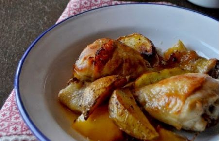 Pollo al horno con limón, ajo, tomillo y patatas especiadas