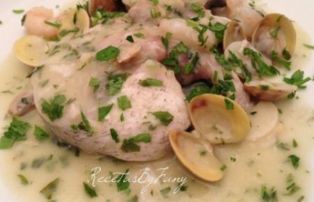 Merluza en salsa con almejas y gambas