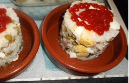 Ayer encontré perdidos en la nevera dos huevos cocidos y sobras de un paquete de bacón, entonces encontré en la web Gastronomia & Cia una idea para la cena en su receta “Ensalada de arroz, bacón y huevo”.
