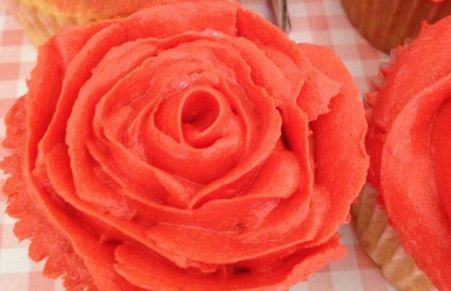 Unos cupcakes de fresas decorados con una boquilla de petalo.