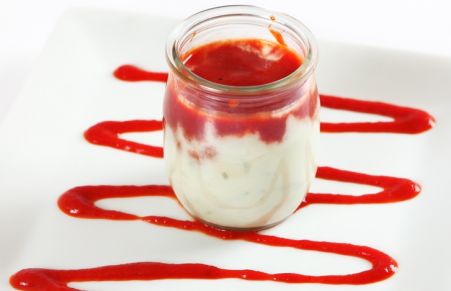 Yogur de bacalao con coulis de pimiento