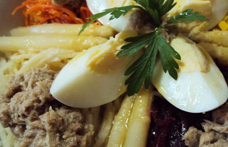 En esta clásica ensalada, se utilizan diferentes tipos de vegetales en base a su color: verde, amarillo, naranja y rojo, basicamente, ... y pudiendo ampliar con morado y blanco... ; para así aportar variados nutrientes.