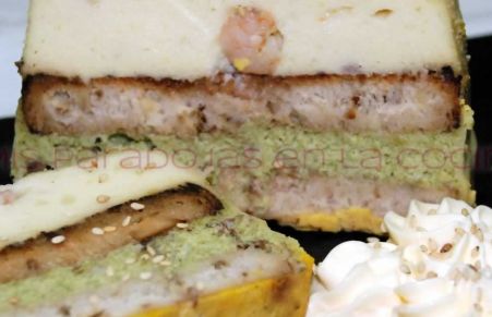 Pastel de 3 verduras con jamón, gambas y champiñones