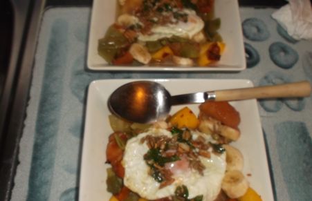 Esta receta sí que es realmente original y deliciosa, consiste en olvidarnos de la típica lechuga que está en muchísimas ensaladas y sustituirla por unas judías verdes acompañadas de fruta, un huevo frito y ajitos... combinación deliciosa.