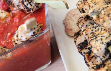 Pinchos de pez espada con salsa de tomates asáos