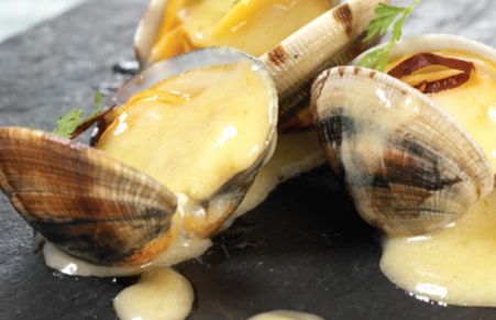 Almejas con holandesa de azafrán y Mantequilla Cadí