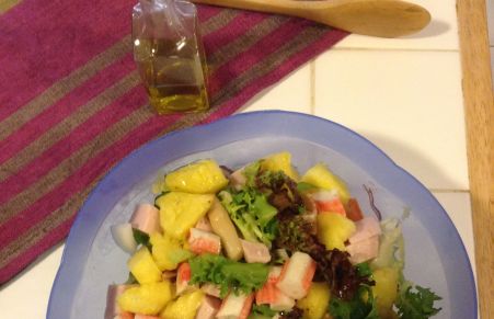 Ensalada de verano con trozos de piña y cuadraditos de pavo acompañados por canónigos, escarola, pata de cangrejo y todo ello regado con aceite de oliva y un toque zumo de limón