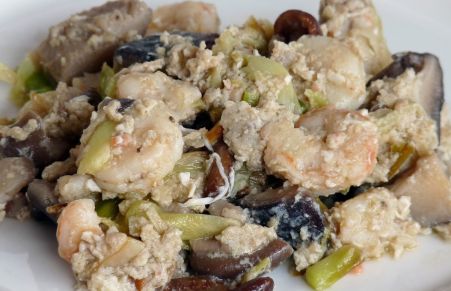 Revuelto de ajetes, setas y gambas