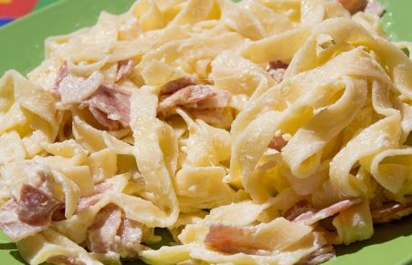 Como elemento distintivo de la receta, esta pasta lleva la mundialmente conocida salsa carbonara. Esta salsa se puede hacer de mil formas, pero la hagamos como la hagamos siempre consideraremos que debe llevar nata líquida y panceta ó beicon. La receta original de esta salsa en sí misma no llevaría nata, ya que sólo con la grasa fundida de la panceta y la mezcla de las yemas de huevo y queso rallado harían que la salsa ligara sin necesidad de agregarle la nata...pero bueno, el caso es que a nosotros nos gusta más con nata ya que queda la salsa más jugosa.