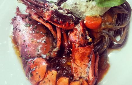 Lobster asado, pasta negra en salsa de tomate y mayonesa de albahaca con wasabi