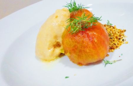 Esfera de tomate relleno de ahumados y encurtidos, sorbete de agua de tomate nitro y tierra de almendras