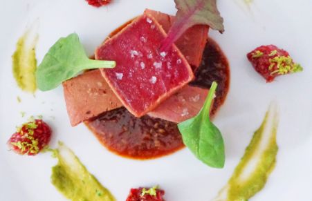 Tataki de atún rojo macerado en crema de miso, yogurt de wasabi y perlas de higos con cítricos