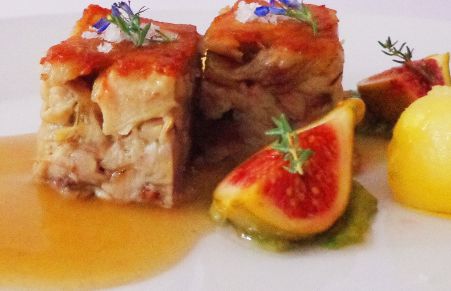 Terrina de lechal a baja temperatura en jugo de romero, crema de albahaca e higos en almibar con patatas confitadas en AOVE