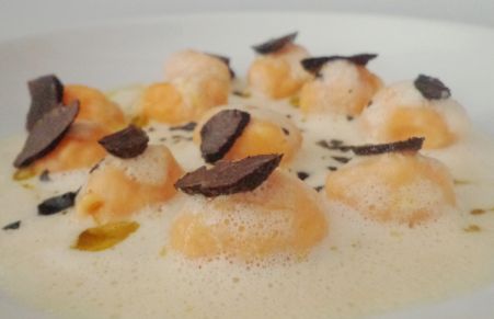 Gnocchis de pimentón agridulce, burbujas aireadas de foie con trufa negra y lágrimas de AOVE picual