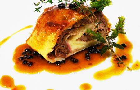 Hojaldre de ternera, queso Idiazabal y salteado de verduras con reducción de jugo de carne a la pimienta negra