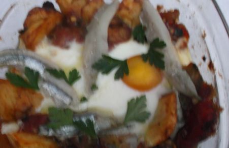 En la web El saber culinario encontré esta curiosa receta, que a la vez que rica, es originalísima y encima tenia restos de sanfaina hecha al fuego en la nevera, por lo cual nada más verla decidí imitarla para la cena.