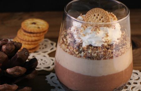 Postre cremoso elaborado con tres tipos de galletas diferentes y presentado en vasitos.
