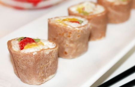¿Qué os parece la idea de un sushi dulce de arroz con leche? La unión de la estética japonesa con la tradición asturiana... el resultado es un postre espectacular como es este Sushi dulce. En el que sustituimos el alga nori por un fino crepe de chocolate y el relleno son bastoncitos de fresa, kiwi y mango.