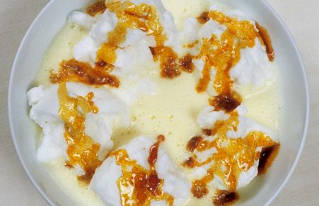 Deliciosa y sencilla receta de crema inglesa. Una preparación pastelera clásica rematada con un flotante de nata y caramelo.