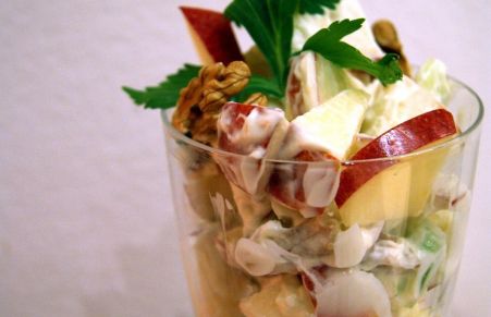Tradicional ensalada Waldorf veganizada con una sabrosa mayonesa realizada con nata de almendras: sin lactosa, sin colesterol y sin culpas.