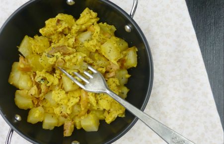 Un revuelto delicioso con un toque de curry hecho con sobras de pollo a la brasa y patatas cocidas.