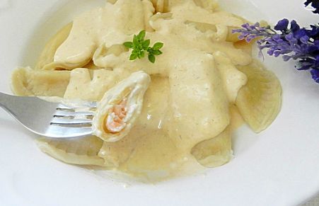 Raviolis caseros rellenos de salmón y queso fresco con salsa de salmón