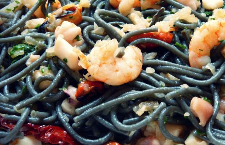 Una combinación perfecta del marisco con la pasta. Receta fácil, sencilla y vistosa.