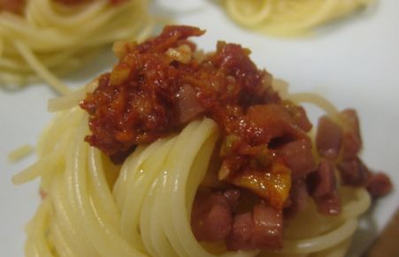 El pesto rojo es una salsa siciliana cuyo principal ingrediente son los tomates secos. En esta ocasión hemos preparado unos espaguetis a los que les hemos añadido pesto rojo y jamón. Una delicia.