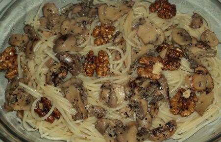 Spaghetti exprés con champiñones y nueces