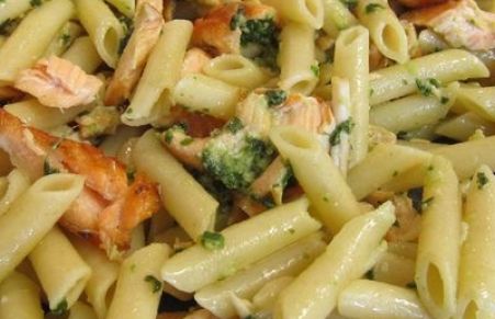 Macarrones integrales con salmón fresco y pesto de albahaca.