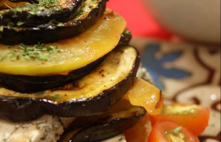 Torre de berenjena asada con tofu griego