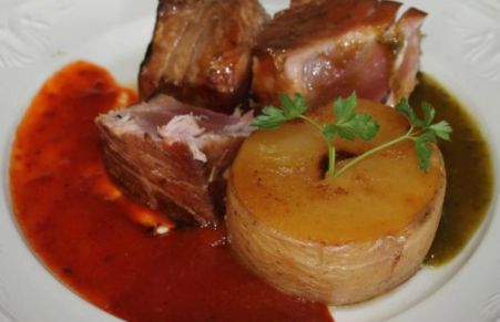 Atún macerado en soja y sellado, el centro poco hecho y jugoso, la patata confitada dos horas y las mermeladas de pimientos rojos y verdes.