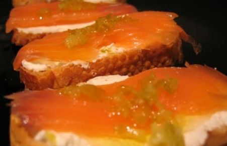tosta de pan, untada de queso azul, loncha de salmon Noruego y cucharadita de mermelada maridaje, se decora con media nuez, es una delicia...