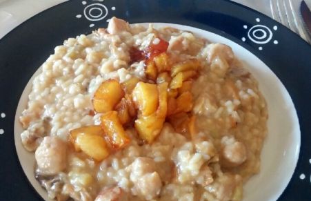 Risotto de setas con mermelada de albaricoque y manzana a la miel