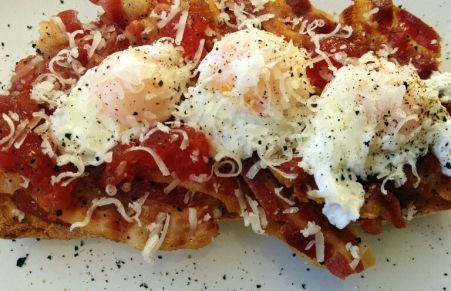 Pan crujiente untado con mermelada de tomate y albahaca, sobre crujiente panceta curada,huevos de codorniz escalfados, queso curado rallado, escamas de sal y pimienta negra.