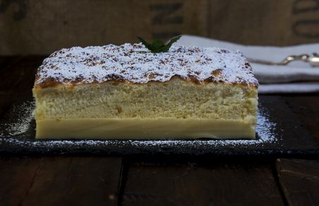 Y es mágico de verdad, tu lo mezclas todo, lo metes al horno y el solo separa dos capas de bizcocho, dejando en el centro como una capa de crema.