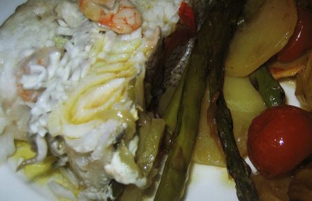 Busca todas las fotos que hemos recibido para esta receta de Merluza al horno rellena de gulas y gambas sobre cama de patatas panadera.