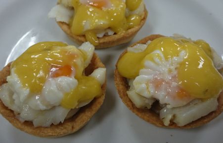 Tartaleta con bacalao al pil pil y huevo poché de codorniz