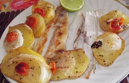Lenguado a la Dominicana, la receta oficial es la siguiente, aunque yo en vez de arroz lo he acompañado con patatas y ahí he puesto la cebolla y el tomate como se ve en la imagen. Sin embargo al lenguado si que le he añadido un poco de salsa de coco GOYA y unas hierbas de eneldo para aromatizar