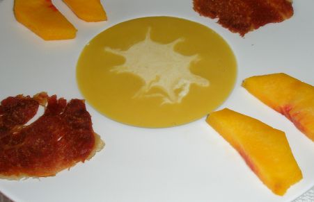 Busca todas las fotos que hemos recibido para esta receta de Crema fría de melocotón de Calanda con crujiente de jamón de Teruel.