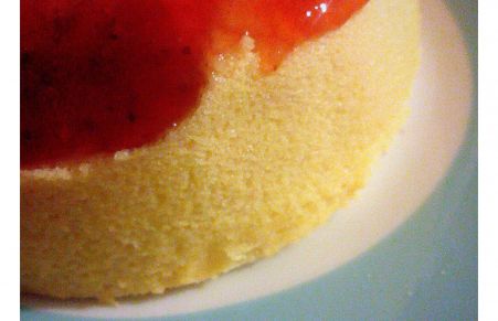Esponjoso pastel típico de Japón. No es dulce completamente, por lo que pega muy bien con la mermelada como decoración.
