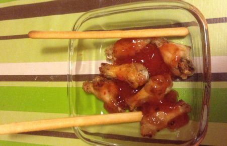 Alitas de pollo fritas y bañadas en mermelada de tomate.