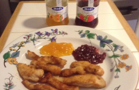 Tiras de pollo, solomillo, empanadas, con mermelada al gusto
