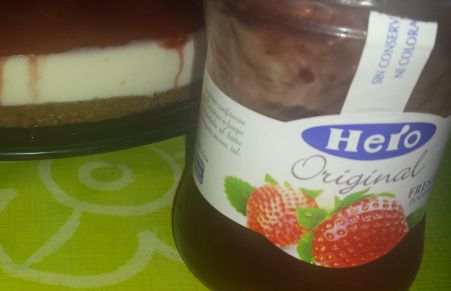 Tarta de queso de untar fria con base de galleta y cubierta de mermelada hero