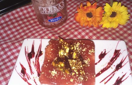 Bizcocho al ron con mousse de queso y mermelada de fresas de temporada con gelatina de mermelada de fresas, y crujiente de pistachos