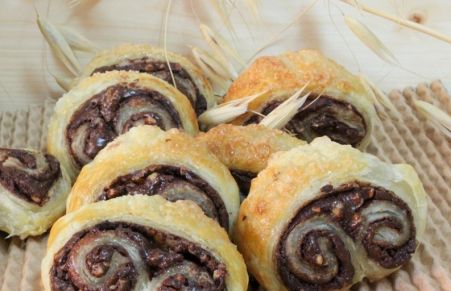 Unas deliciosas palmeritas rellenas de chocolate y almendra que se hacen rápidamente y quedan estupendas para una merienda o desayuno.